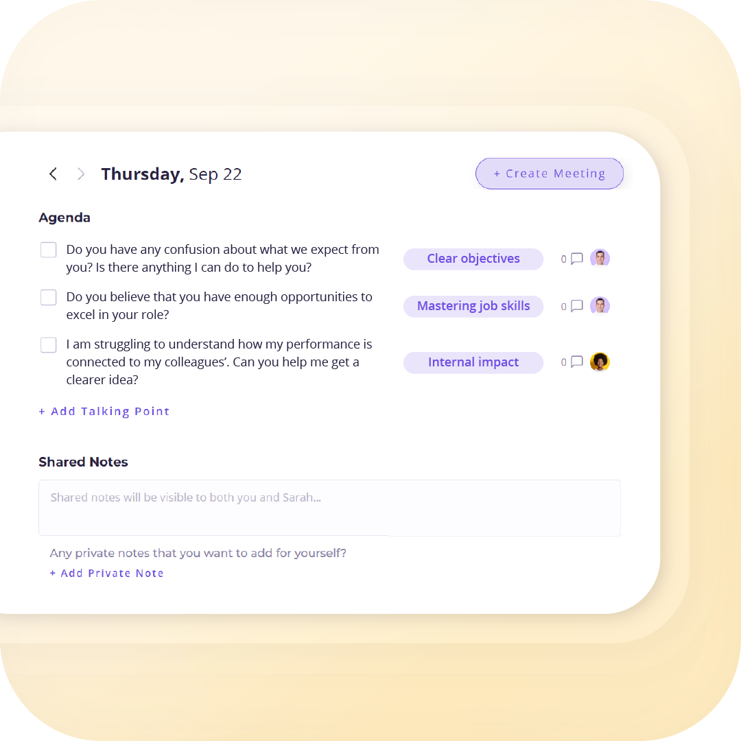 Both the parties can set their talking points, wrap up with shared and private notes, and have the history of all their 1:1s in their fingertips, at all times.