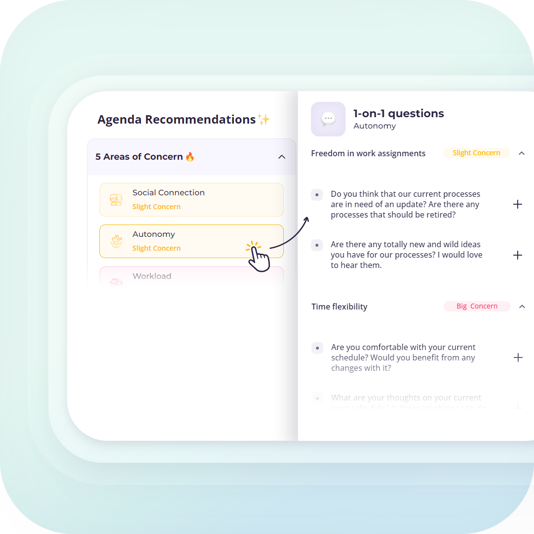 Bridge the gap between employee mental well-being insights and 1:1 conversations. Empower managers to discuss the things that matter the most to each employee and address early signs of burnout &disengagement.